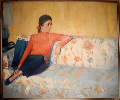 This oil painting depicts a woman seated on the far left of a sofa, next to a lamp.