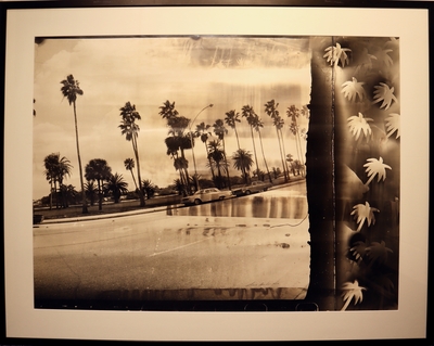 This artwork features two cars on the street with palm trees.
