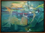 This abstract expressionist art piece features a range of tones, including blue, green, red, and yellow.