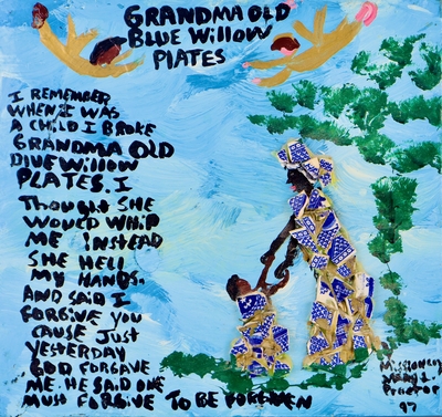 This artwork shows text to the left of the board, two winged figures on the top, and trees on the right. On the right, a figure holding hands with a kneeling figure, both have mosaic blue tiles on their clothes.