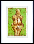 This print shows a nude figure with breasts surrounded by green and brown organic lines and text at the bottom.