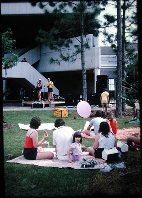 Slide (35mm): Spectators watching band, Earth Music Fest, University of North Florida, Jacksonville, Florida. Building 10 in the background. Date: April 14, 1984