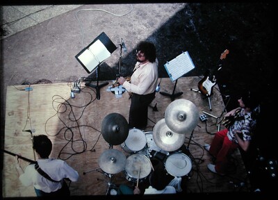 Slide (35mm): Overhead view of unidentified band playing on a platform stage, Earth Music Fest, University of North Florida, Jacksonville, Florida. Date: April 14, 1984