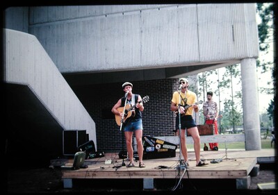 Slide (35mm): Two unidentified musicians playing on a platform stage, Earth Music Fest, University of North Florida, Jacksonville, Florida. Building 10 in background. Date: April 14, 1984