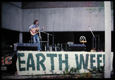 Slide (35mm): Unidentified musician with guitar playing on stage with Earth Week banner on front. Earth Music Fest, University of North Florida, Jacksonville, Florida. Date: April 14, 1984