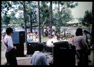 Slide (35mm): View of crowd from behind band playing during Earth Music Fest, University of North Florida, Jacksonville, Florida. Boathouse Lake and festival tent in the background. Date: April 14, 1984