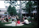 Slide (35mm): Spectators sitting in the grass, on blankets and chairs, during Earth Music Fest, University of North Florida, Jacksonville, Florida. A band setting up on the right, outside building 10. Building 1 in the background. Date: April 14, 1984
