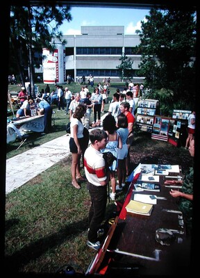 Slide (35mm): People talking to campus club representatives, Oktoberfest, University of North Florida, Jacksonville, Florida. Date: October 20, 1984