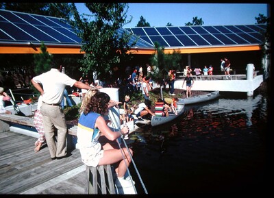 Slide (35mm): People watching canoeing on Candy Cane Lake during Oktoberfest celebration, University of North Florida, Jacksonville, Florida. Date: October 20, 1984