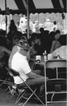 Negative (35mm, Black and white): Festival attendees sitting at tables under a striped tent, Oktoberfest. Unidentified man in foreground wearing German Hunter Fedora hat. Date: October 10, 1987