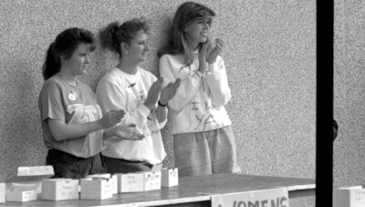 Negative (35mm, Black and white): Three unidentified women at the women's race results table., Oktoberfest. Left: Woman wearing a Zeta Tau Alpha t-shirt. Date: October 10, 1987