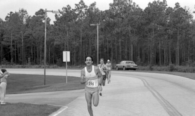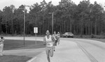 Negative (35mm, Black and white): Several Runners in a line, running on paved road, Oktoberfest. Runner 246 in the front. Date: October 10, 1987