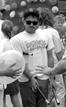 Negative (35mm, Black and white): Unidentified man wearing sunglasses and an Einstein A Go-Go t-shirt, Oktoberfest. Date: October 10, 1987