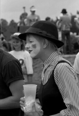 Negative (35mm, Black and white): Unidentified clown, Oktoberfest. Date: October 10, 1987