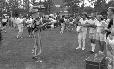 Negative (35mm, Black and white): Unidentified people attending the festival watch clown juggle, Oktoberfest. Date: October 10, 1987