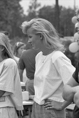 Negative (35mm, Black and white): An unidentified woman attending Oktoberfest. Date: October 10, 1987