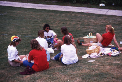 Positive film (35mm, color): Unidentified people socializing, sitting on The Green, Oktoberfest. Part of a slide film strip. Date: October 10, 19877