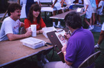 Positive film (35mm, color): Unidentified artist drawing a cartoon caricature of an unidentified couple, Oktoberfest. Part of a slide film strip. Date: October 10, 1987