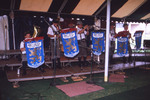 Positive film (35mm, color): Hungry Five Plus German Band playing on stage, under a striped tent, Oktoberfest. Part of a slide film strip. Date: October 10, 1987