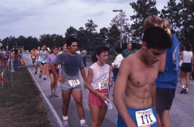 Positive film (35mm, color): Unidentified runners complete 5K. Front three runners: Runner 171, 2nd runner 236 accepts card from race personnel, and 3rd runner 216. Part of a slide film strip. Date: October 10, 1987