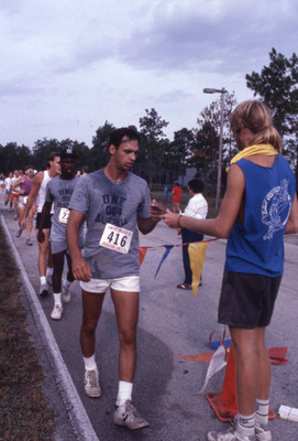 Positive film (35mm, color): Unidentified UNF baseball players and other runners complete 5K. Front: Runner 416, wearing UNF 004 Baseball t-shirt, accepts card from race personnel. Another baseball player is in line behind him. Part of a slide film strip. Date: October 10, 1987