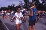 Positive film (35mm, color): Unidentified 5K runners at end of the race accepting cards from unidentified race personnel. Front: Runner 134. Part of a slide film strip. Date: October 10, 1987