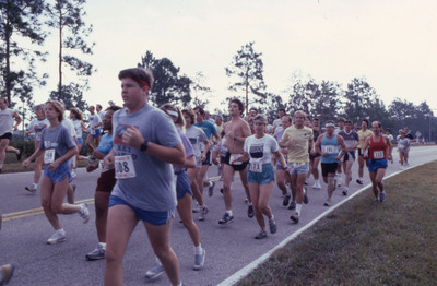 Positive film (35mm, color): Unidentified runners on paved road, Oktoberfest 5K. Part of a slide film strip. Date: October 10, 1987