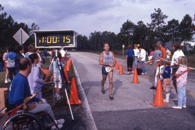 Positive film (35mm, color): Unidentified runner and people watching the Oktoberfest 5K. Center: Runner 326, time recorded on left as 1:00:15. Part of a slide film strip. Date: October 10, 1987
