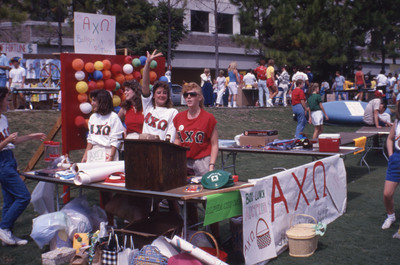 Positive film (35mm, color): Alpha Chi Omega table with a Balloon Dart Throw game and Box-lunch auction sign, Oktoberfest. Part of a slide film strip. Date: October 10, 1987
