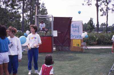 Positive film (35mm, color): Unidentified people getting ready to dunk an unidentified woman in the dunking booth, Oktoberfest. The woman in the dunking booth is wearing a Zeta Tau Alpha sweatshirt. Signs to the right of dunking booth: Today and Forever - blue lettering on white fabric. Three Throws for $1.00 on yellow paper. Part of a slide film strip. Date: October 10, 1987