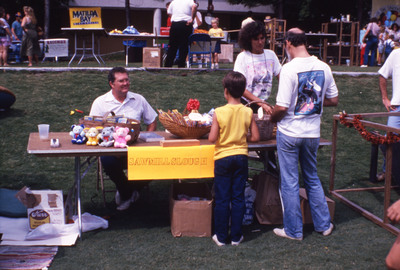 Positive film (35mm, color): Unidentified people at the Sawmill Slough club table, Oktoberfest. Part of a slide film strip. Date: October 10, 1987