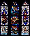 In this triple lancet window at Grace Episcopal Church in Orange Park, Florida, the central image cites Psalm 8, which praises God's majesty and benevolence. On the left is the familiar image of Jesus with the world's children. The right-hand window shows a welcoming Jesus among butterflies, citing Isaiah 43:1: "I have called you by my name; you are mine."
