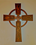 A cross hangs in the choir loft at First Presbyterian Church of Green Cove Springs, Florida. It bears symbols including a scroll, for the Ministry of the Word; a dove, for the Holy Spirit; a fish, an early symbol for Jesus; grapes and wheat, for the bread and wine of Holy Communion; and Alpha and Omega, for God as the Beginning and the End.
