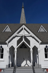 An image of the front entrance of the church. Wooden ornamentation, called gingerbread, is another mark of the Carpenter Gothic style of First Presbyterian Church of Green Cove Springs, Florida.