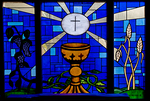 Eucharist window at Sacred Heart Mission in Green Cove Springs, Florida. Symbols include the chalice and consecrated bread, plus the grapes and wheat that made the elements.