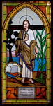 St. Jude carries an image of Jesus around his neck in this window at Sacred Heart Mission in Green Cove Springs, Florida. A legend says he bore the image to the king of Edessa, who was healed by it.