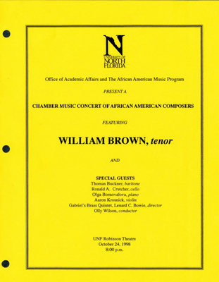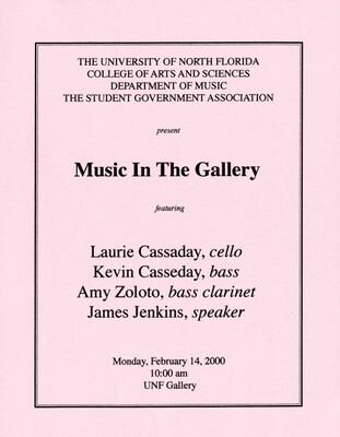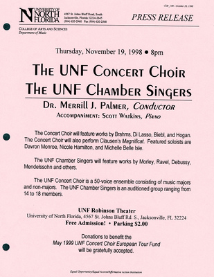 Disc 1: The UNF Jazz Ensemble I, J.B. Scott director; featuring Ernie Watts, tenor sax (6th-7th works). Disc 2: Dave Holland, [bass] and Quartet West (Ernie Watts, saxophones; Alan Broadbent, piano; Larance Marable, drums). Disc 1. It's alright with me / arr. Eric Richards (Dan silva, alto sax; Tim Pitchford, trombone; David Champagne, trumpet; Eric Riehm, tenor sax) -- Basic-ally your / Thad Jones (Scott Jefferson, guitar) -- "Saxoffonist" / Mark Taylor (David Guidi, tenor sax; Jeremy Siegel, baritone sax; Perry Greenfield, alto sax) -- I'm beginning to see the light / arr. Quincy Jones (Lisa Kelly, vocalist; David Champagne, trumpet; Dan Palmieri, piano) -- I want to be happy / Gene Thorne (Lisa Kelly, vocalist; Eric Riehm, tenor sax) -- Truth / Bob Mintzer -- Joyous reunion / arr. Mike Crotty (Tim Pitchford, trombone) -- Disc 2. Selections to be announced from stage (Dave Holland and Quartet West). Date: February 4, 1999