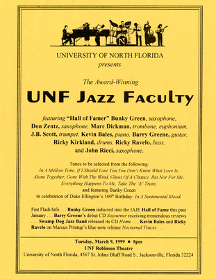 • UNF Jazz Faculty Recital by Bunky Green, Don Zentz, Marc Dickman, J.B. Scott, Kevin Bales, Barry Green, Ricky Kirkland, Ricky Ravelo, and John Ricci