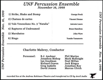 UNF Percussion Ensemble (B.J. Anckner, Jonathan Bishop, Ian Goodman, Richard Gowen, Greg Isabelle, David Jensen, Phil Marino, Mark McKnight, Noël Millan, Jack Ringca, Jonathan Roy, Marcus Ulrich) ; Charlotte Mabrey, conductor.