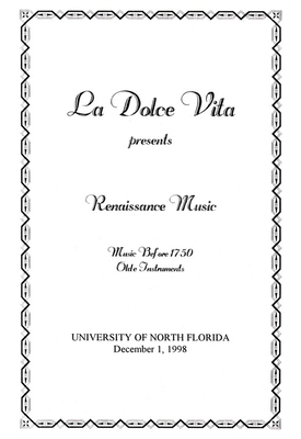 Pavane / Arbeau -- Come again: sweet love doth now endite / John Dowland -- Daphne -- Pastime with good company / Henri VIII -- If my complaints (Captain Digorie his Galiard) / John Dowland -- Miller of Dee / words [by] Isaac Bickerstaffe -- Are you going to Scarborough Fair -- Estammpe -- Pastoral / Hunsicker -- Hornpipe ; Allegretto Giocoso / G.F. Handel -- Chanconeta Tedesca -- Allemannde -- Brosse -- Black-eyed Susan / Richard Leveridge -- Riu, riu, chiu -- Greensleeves. Date: Sept. 27, 1999