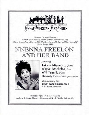 • Nnenna Freelon and her band also featuring the UNF Jazz Ensemble I Set 1 by Nnenna Freelon, Takana Miyamoto, Wayne Batchelor, Will Terrill, Beverly Botsford, J.B. Scott, and University of North Florida Jazz Ensemble I