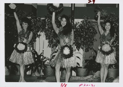 Photograph (black and white film): Luau themed homecoming event. Three unidentified women wearing lei and grass skirts. Undated.